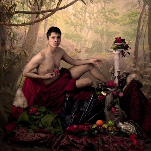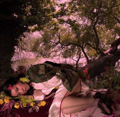 Mei Xian Qiu is a Chinese, American, and Indonesian fine art photographer whose current series, Qilin, is showing at the Koeipkin Gallery in Los Angeles through April 19, 2014. Mei’s work is rich in metaphor and meanings, and she has had tremendous success. In the following interview, she opens up about her history and how her unique visualizations came to be.How old were you when you moved to the United States, and how has being Chinese and American informed your art?I moved to the U.S when I was four to escape persecution in Indonesia. My family lived in Indonesia for three generations, since the 1880’s. Coming from a very conservative country, my parents wanted to frame their lives differently. Although they felt a certain exultation from this new freedom, they perceived the U.S. as an amoral place and not a place to raise children.Hence, they gave all their children away, and I was sent back to Indonesia. My mother separated from my father and decided she wanted her family back. She and my father began the difficult process of reclaiming their four children. Since that time, I have moved back and forth several times.Inter-culturalism is interesting and often complex. My work stems directly from being Chinese, American, and Indonesian. My view of Chinese culture is necessarily fantastical, because I grew up where being Chinese was illegal and we had no access to Chinese culture in terms of traditions or morays. At the same time, we were labeled as Chinese and persecuted. In my work, I try to create a “Chinese” history in self-reinventions — skewed and out of whack, and completely unrestricted.My main cultural identity has been American and Los Angelino, with a view towards the East like something out of a dream. My work is clearly American (as opposed to Chinese), especially in the way the subjects challenge the viewer with the directness of their gaze. When did you become an artist, and how did photography start to play a role in that? Probably from my mother’s belly! My caretakers would ask me to stop drawing and go outside to play with my friends. My life history posed questions that I had to tackle in an open handed way. Photography was an outgrowth of painting. It is an ideal medium for me because photographs bombard an average 21st century human on a daily basis, combining commercial and political propaganda with images of personal and societal history. I find this daily merging of fiction and reality interesting. I want my work to have that illusion and connection to reality. How do you like living in Los Angeles? What are the pros and cons, and is there somewhere else you would like to be? Perhaps it’s the connection to cinema, but from when I arrived in Los Angeles at sixteen, I felt this freedom — this relative tolerance of differences, ideas, and exploration. It took me a few years to get accustomed to the landscape, the colors and the even the architecture, but I’ve now acquired a deep appreciation for these characteristics. I would like to be in a lot of places. I miss Indonesia for instance, but am unsure if what I miss still exists. Your newest series Qilin and Let a Thousand Flowers Bloom have a lot of deep and diverse things going on. Can you distill for the layman what you are trying to say? A simple distillation would be that the work presents an eroticized Rorschach to view our shifting perceptions, which are impermeable and unchanging. We live in an internal self-imposed landscape of an increasingly global monoculture. Who are we and what will we become, as seemingly indigenous cultural origins become more and more attenuated? Does our view of ourselves start to resemble how others view us at its most trite, streamlined and iconic? A Qilin (Qi–male, lin–female) is an amalgamated Chinese creature, a hybrid of real and imaginary beings, and an ancient compass to the West. It pushes the work of Let a Thousand Flowers Bloom to its most dualistic, hybridist components. In the image Cherry Blossoms from this series, there is a woman beautifully dressed in front of slaughtered animals. What is the meaning of this? Did you photograph the animals or have them imported into the shot? To understand this image, it is useful to look at the general outlines of the series Let a Thousand Flowers Bloom. Mao Zedong quoted a classic Chinese poem, “Let a hundred flowers bloom. Let a hundred schools of thought contend.” In a great society, different points of view and free expression should prevail. As a result, intellectuals and artists came out of hiding, living for this “beautiful idea,” even though they must have known it would be ultimately fatalistic, by creating a utopian kernel inside a dystopian vision. The photographs portray a mock annexation of the U.S. by the Chinese, creating a hundred flowers movement here. The actors in the photographs are American artists or academics specializing in Chinese history — the very group targeted in the hundred flowers movement. The Chinese uniforms come from a Beijing photo studio where cultural revolution imagery is re-enacted by foreign tourists. The uniforms are brought home as souvenirs. In this particular image, the woman is wearing a classical Chinese dress called a qipao, considered outmoded and “anti-modern,” in contemporary China, where Western pop culture and fashion are wholeheartedly embraced. She is holding cherry blossoms, a symbol of feminine domestic power and the dominance of beauty. In image 8990, you have two gay soldiers, one Chinese and the other American, embracing in front of a deer in the forest. What is the symbolism here and did you use stock imagery for this background? If soldiers were countries, what would they do? That was my initial question, since soldiers were sometimes the only contact one country had with another. Countries courted, fought, and got into bed with one another. I used two male soldiers because I did not want gender roles to be part of what the image was a